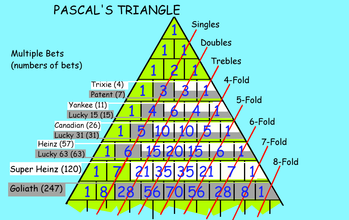 When you looked at the Patent bet, you were considering three selections, so look along the horizontal line indicated with the 3. The red lines show us that your Patent bet had three singles, three doubles and one treble. The LUCKY 15 and the YANKEEIf you want to choose four selections, what are the options? There are four singles, six doubles, four triples and one 4-fold bet. If you wanted to bet on all these options, that would be 15 bets altogether and is known as the Lucky 15. Of course placing 15 bets gets expensive, so generally the individual bets are quite small, e.g. $1 or perhaps 10p each. You'll get something back unless every single one of your selections lets you down! As the single bets don't pay as well as the multiple bets, people often don't bother with them. Instead they would just bet on the six doubles, four trebles and the 4-fold. This is 11 bets altogether and is known as a yankee. The LUCKY 31 and the CANADIANIf you want to choose five selections, there are five singles, 10 doubles, 10 trebles, five 4-fold bets and one 5-fold bet. In total that makes 31 bets and it is known as the Lucky 31. If you don't want the five single bets, then the other 26 bets together are known as a Canadian or even a Super Yankee.